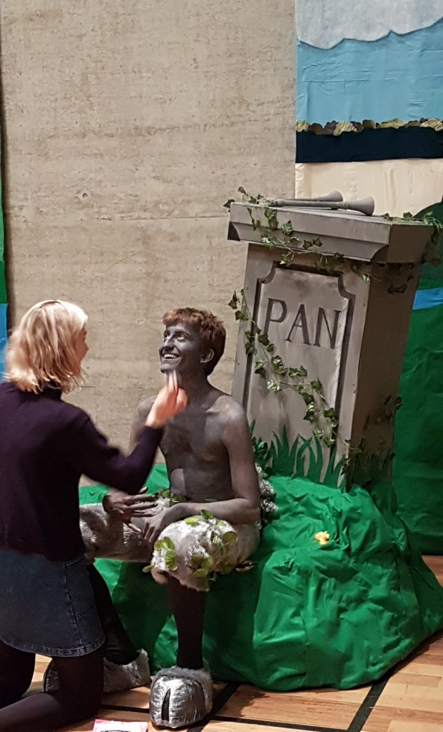 Daphnis and Chloe featured a living statue of the god Pan. We engaged a professional makeup artist to ensure an effective look (seen here without wig and horns). Pan’s plinth was created by our student designer who also designed the set pieces and backdrop of Grantchester Meadows. The backdrop made clever use of applique to enable its production by 14 – 16 year olds.