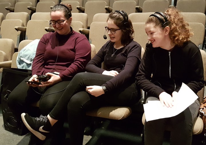 Stage managers taking a break between shows during Daphnis and Chloe. On the left of this typical group is the lead for the show, a CYO alumna who is now working in the industry. On the right is one of our youngest ever trainees, aged 12, enjoying the excitement of her first production.