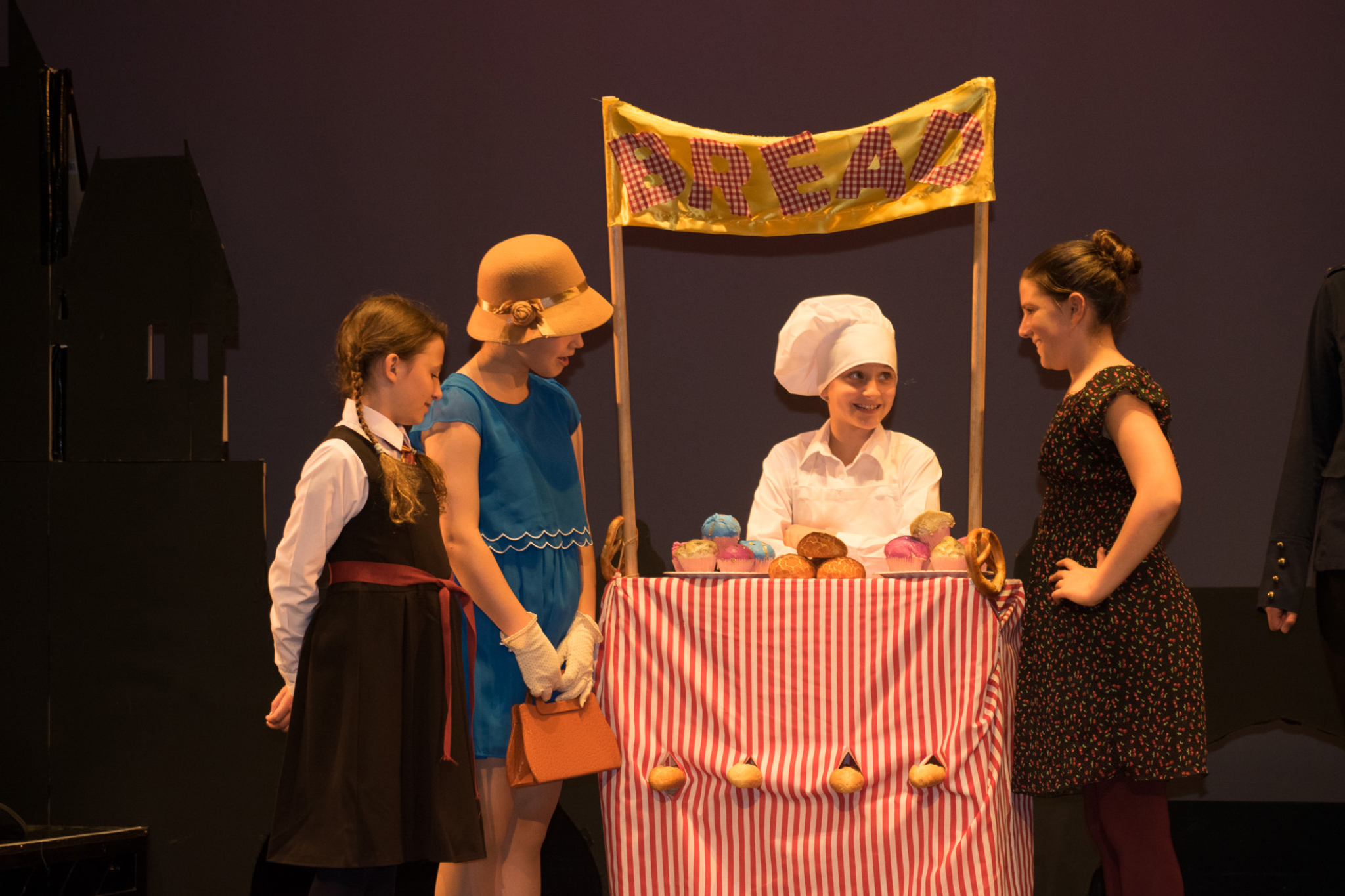 Daphnis and Chloe featured a living statue of the god Pan. We engaged a professional makeup artist to ensure an effective look (seen here without wig and horns). Pan’s plinth was created by our student designer who also designed the set pieces and backdrop of Grantchester Meadows. The backdrop made clever use of applique to enable its production by 14 – 16 year olds.